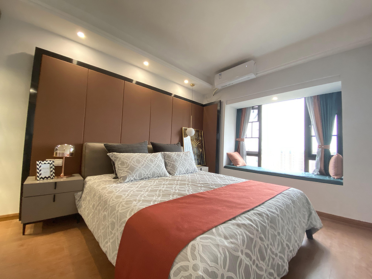 主卧整体色彩偏暖色系,整个空间主要是通过辅助光源及氛围灯来提亮夜间光源而并没有采用主灯设计,这样的设计初衷让整个空间更加温馨、简洁