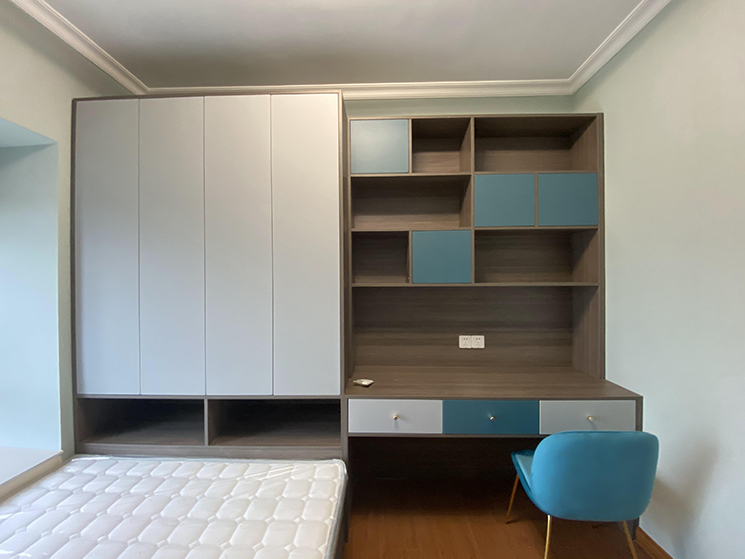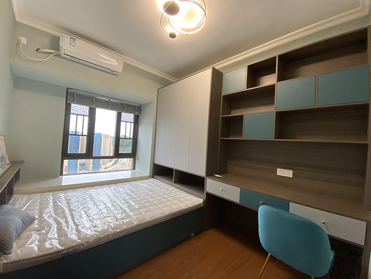 儿童房采用榻榻米设计,高级灰和冰魄蓝撞色设计略显高级加金色拉手为整个空间增添一丝活泼。整个墙面采用薄荷绿,颜色比较浅,待在房间感觉心中非常安静舒适。