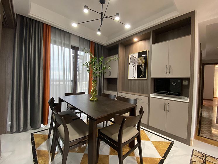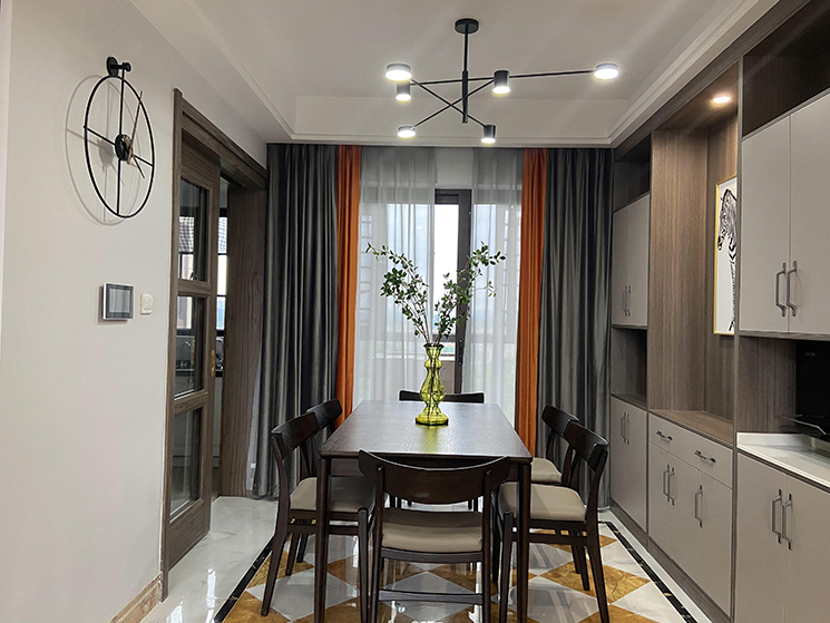 餐厅的装修延续了客厅的主色调,依然是大面积的采用浅灰色来进行整体装饰。胡桃木色的储物柜置顶设计,将空间层高充分利用起来,增加了餐厅空间的收纳功能。