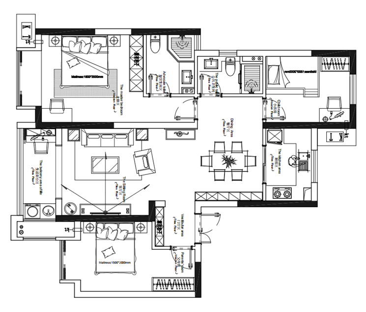 这套房本身楼层不是特别高,所以我们在设计的时候将阳台打通与客餐厅结合,这样不仅让整个客厅的容积更大不显得拥挤同时又能很好的解决采光的问题。在阳台的两侧各设计了洗衣柜和储物柜,这样更大化的利用阳台空间。