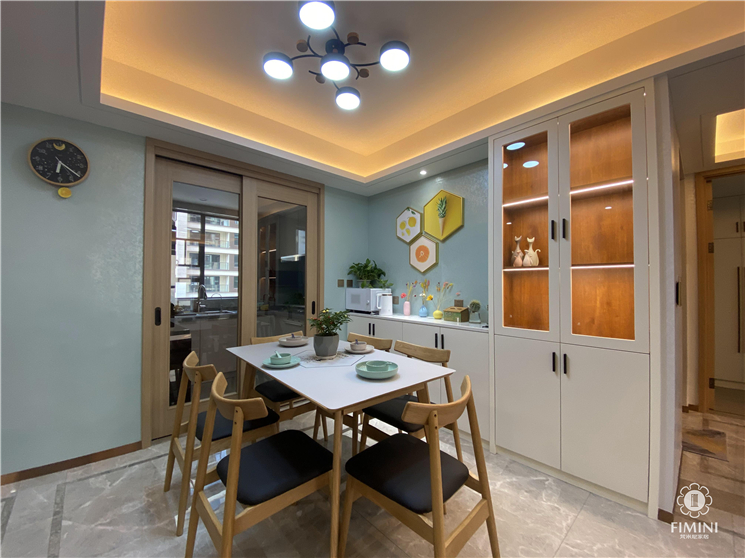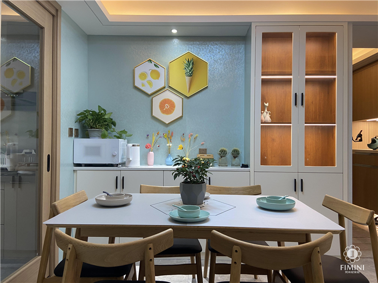餐厅厨房位置不是很大,为了增加生活的便利,酒柜设计没有成整排柜子,这样更加方便以后在生活中实用性,玻璃柜门里面采用层板灯来增加就餐氛围,餐桌椅以及墙面的配饰我们都采用自然元素的设计。