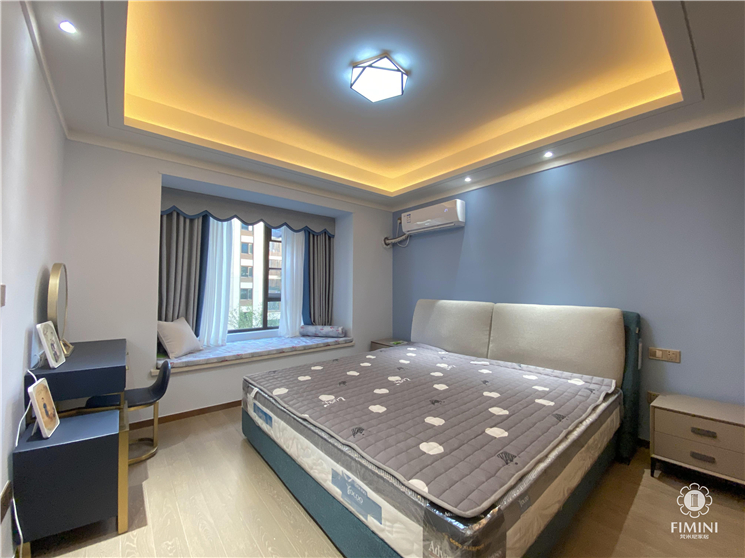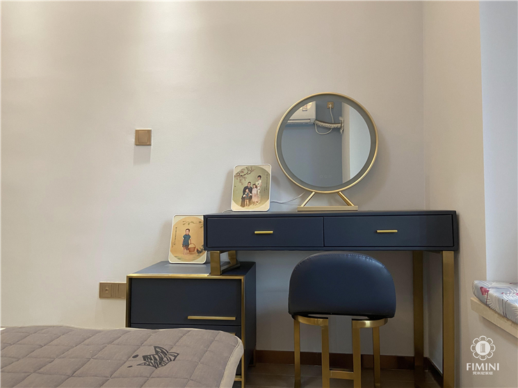 主卧床头背景采用蓝色的墙漆搭配白色的布艺网红床,非常简洁温馨,在床头的对面我们搭配了一款深蓝色带金属质感的网红梳妆台,凸显女主人对于生活中的那份精致与美好。