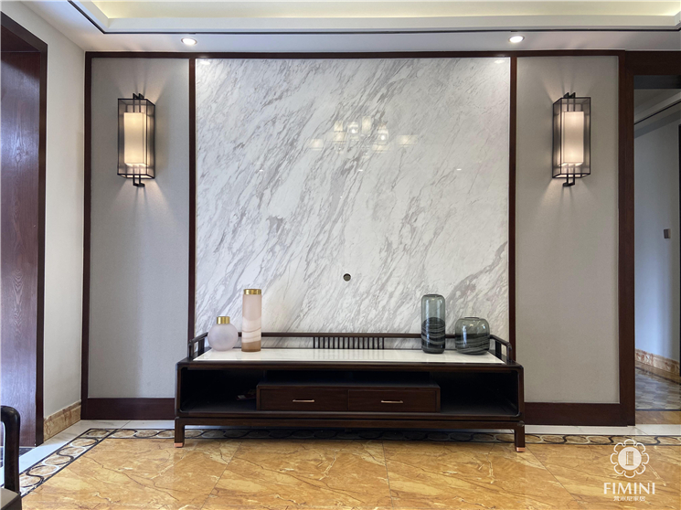 电视背景墙采用麻面布艺软包+爵士白大理石设计,衔接处辅以木饰线条装饰,设计讲究对称,中式元素的壁灯搭配布艺软包在灯光的照射下非常柔和,带给我们的感受是素雅和质感。由此我们也可以看出业主本身是非常含雅。