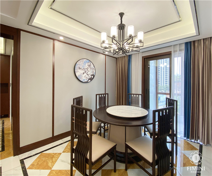 餐厅延续了客厅的设计,墙面同样采用墙布及木饰条装饰来呼应整个客餐厅的设计,中间位置设计了一幅带有中式泼墨写意装饰画,在窗帘的选择上用咖色作为主色调呼应整个空间,辅以浅蓝色的撞色设计让这个空间更加协调和具有朝气。